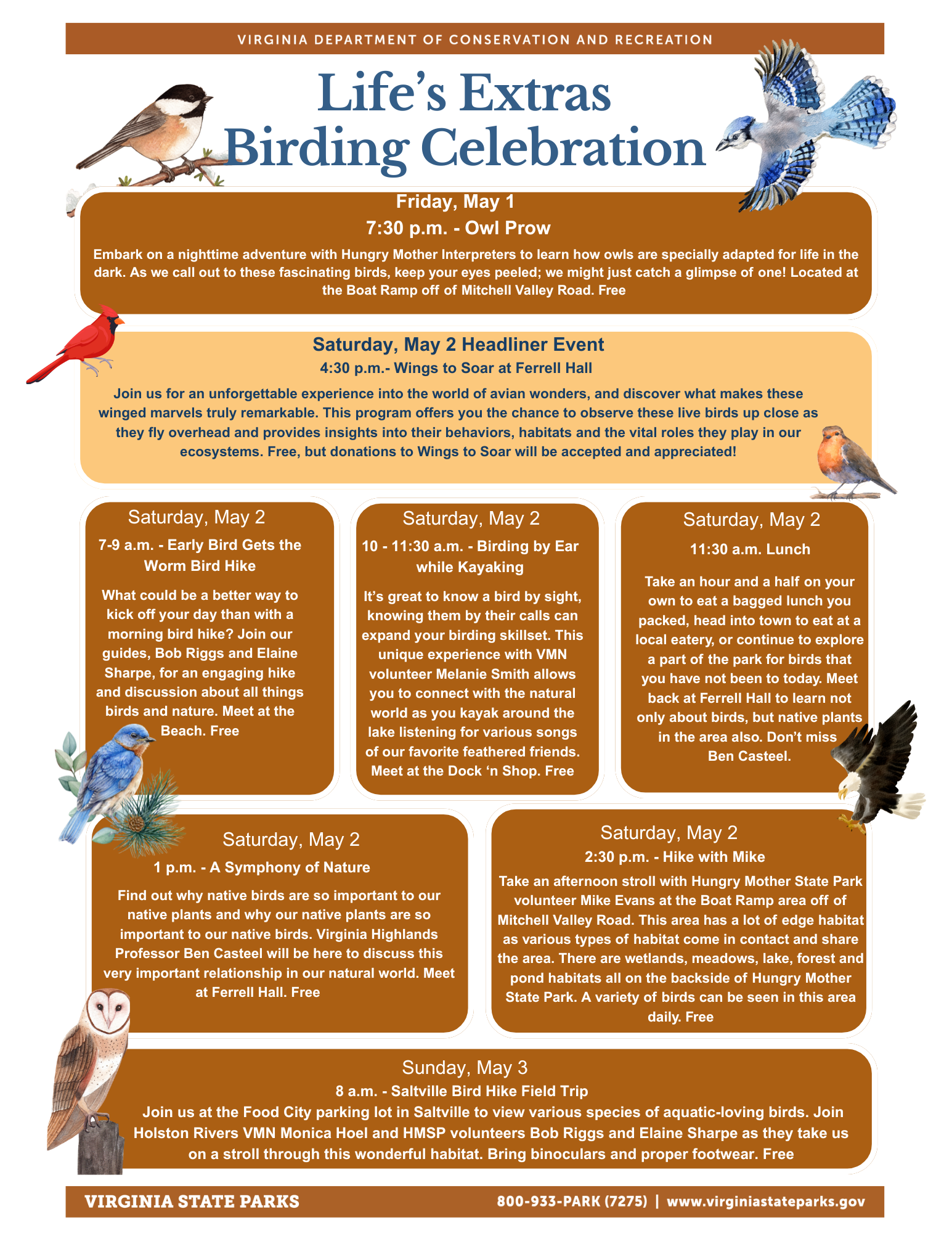 Get ready for an unforgettable journey into the world of birds of prey and other avian wonders. During this live program, you’ll have the rare opportunity to watch these remarkable birds up close -even flying right overhead - as you learn about their behaviors, habitats, and the critical roles they play in keeping ecosystems healthy. Donations to Wings to Soar are welcome and appreciated!