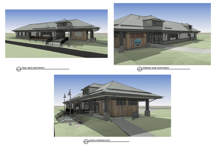 (Editors: Follow this link to download an image. Photo caption: New trail center rendering showing different views of the building.)