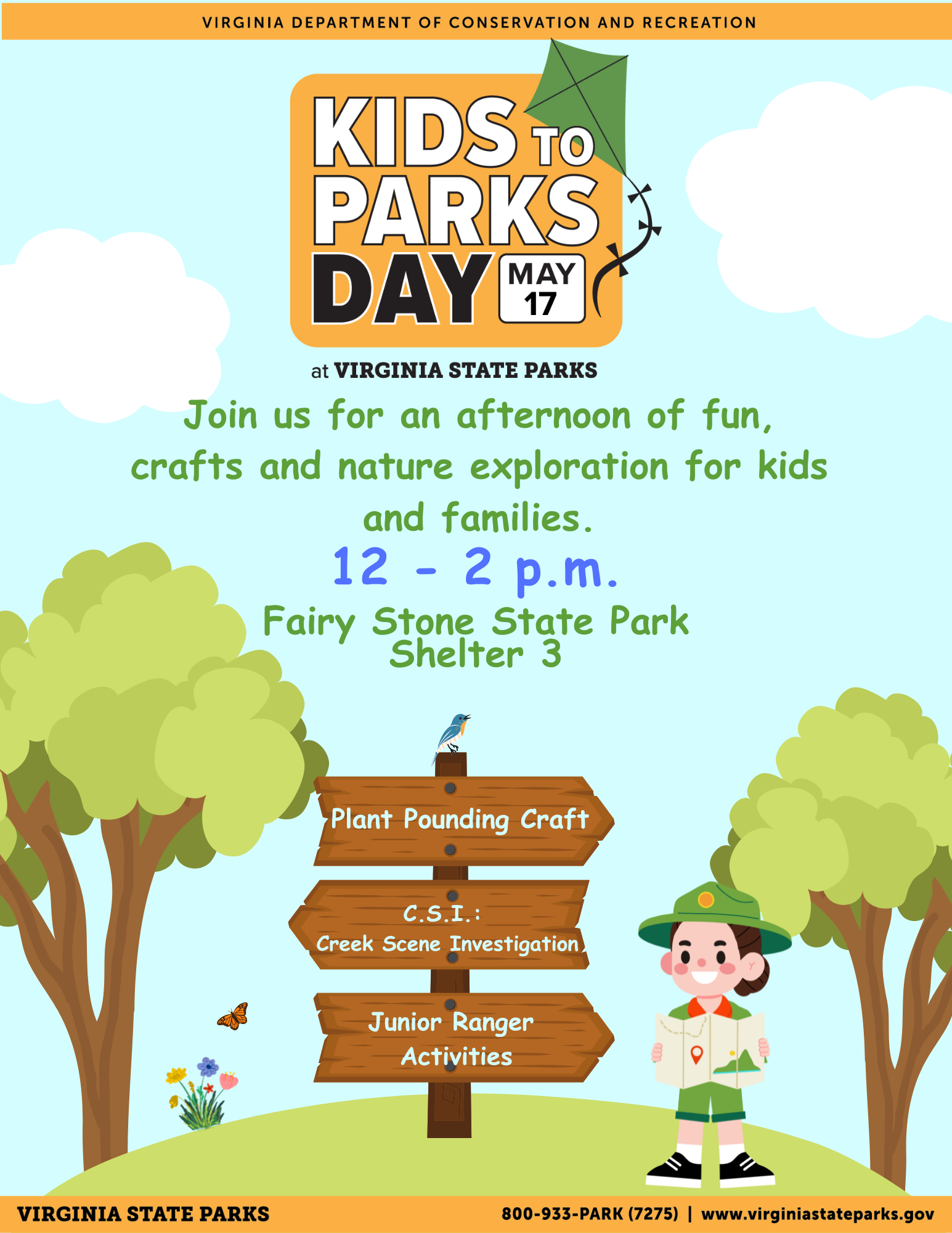 Virginia State Parks celebrates National Kids to Parks Day on the third Saturday in May by offering a variety of fun, family-friendly activities, from nature scavenger hunts and ranger-led hikes to fishing clinics and flora and fauna wagon rides. This annual event encourages kids to explore the outdoors while learning about wildlife and engaging in hands-on environmental education.