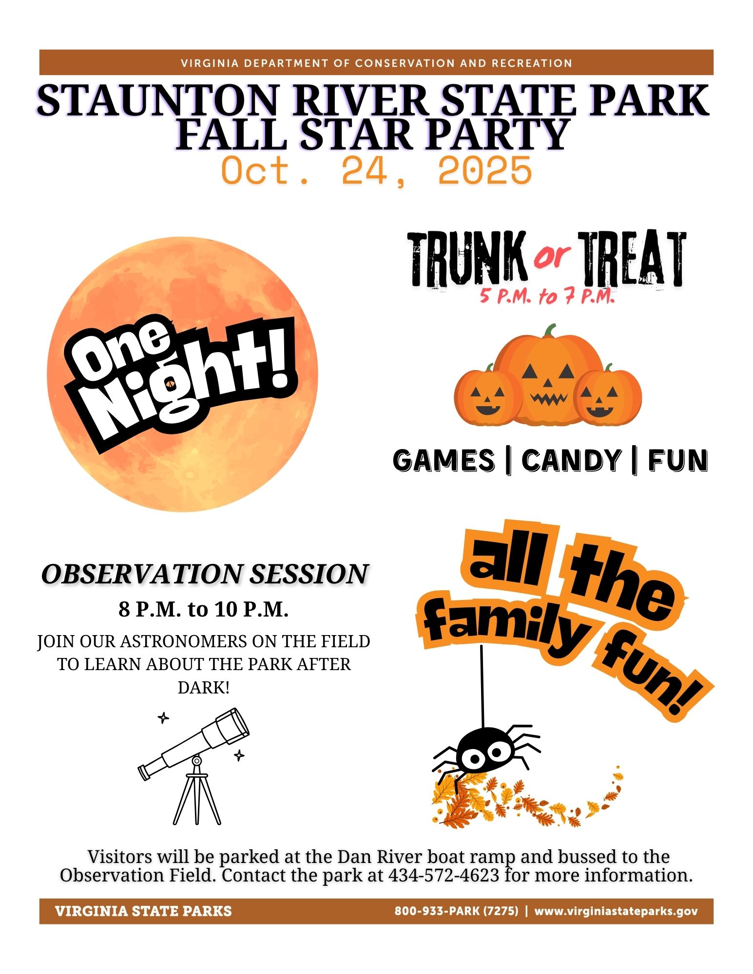 Join us for a spooky fun night under the stars! Fun, games, costumes, candy and more for your whole family! We will park guests at the Dan River boat launch and bus you down to where all the fun is.